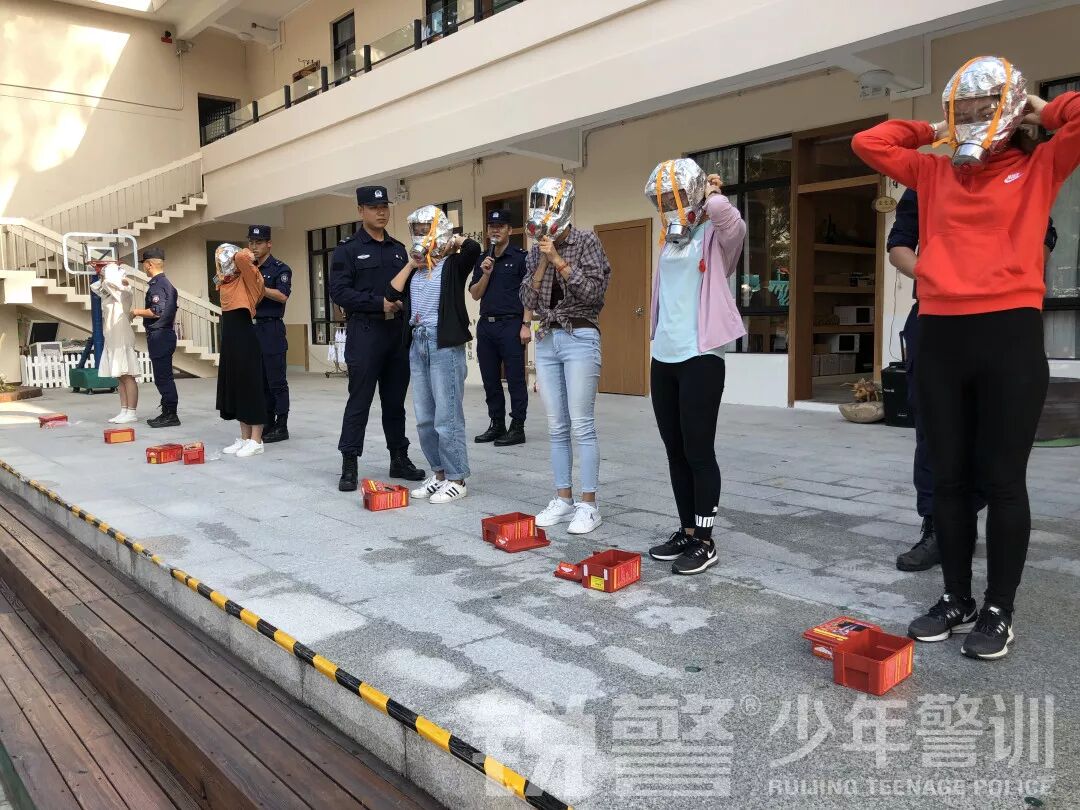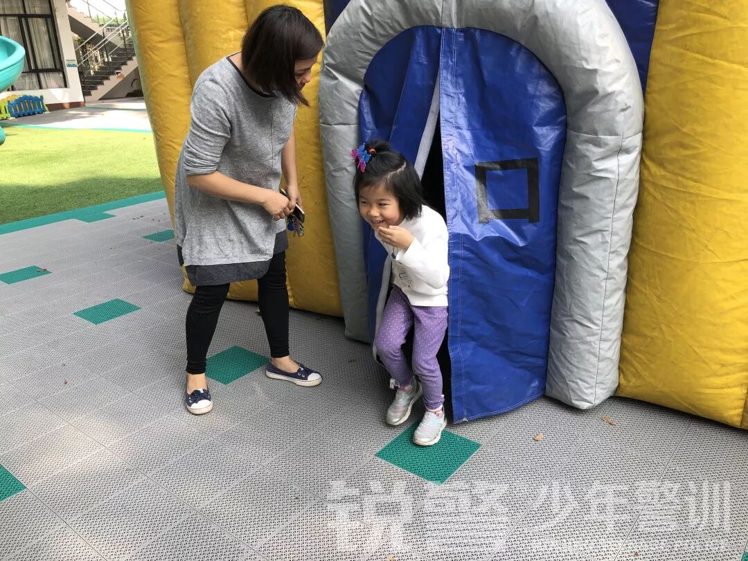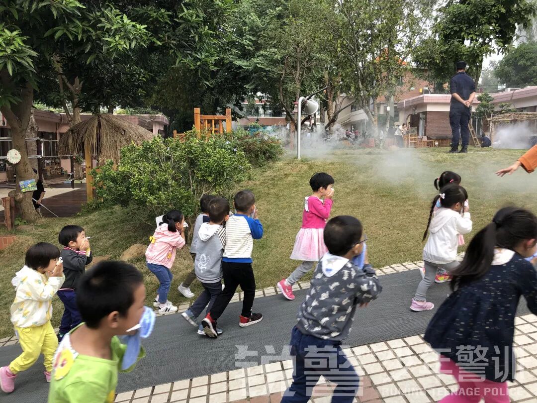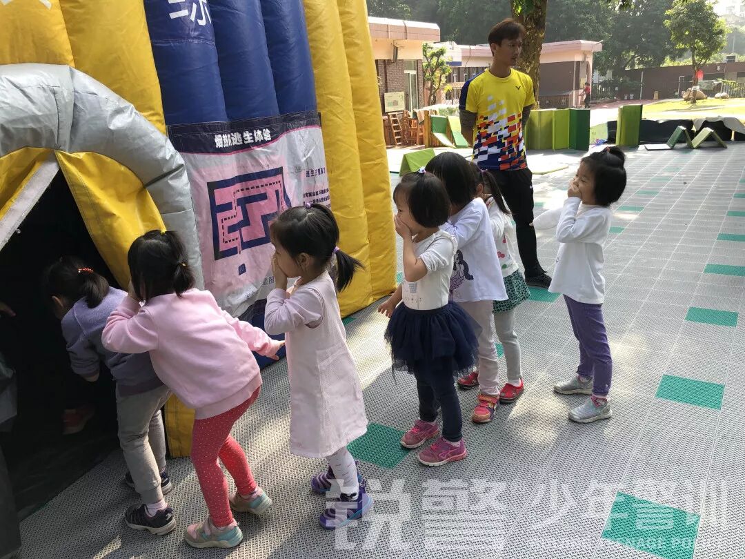 在烟热环境逃生体验中,小朋友要学习用湿毛巾捂住口鼻,不要慌张,在教官以及老师的带领下,方能通过黑暗的烟热环境,最后“逃出生天”。